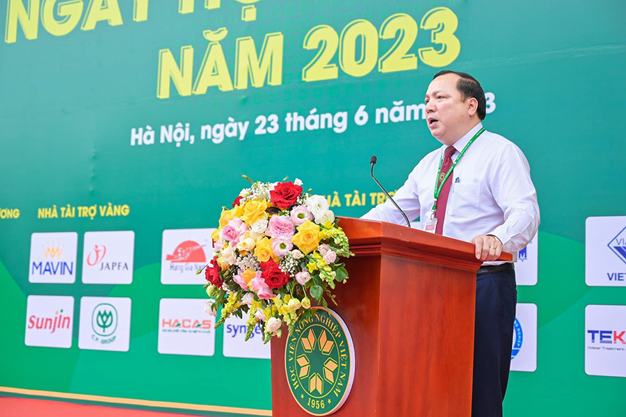 TS. Vũ Ngọc Huyên, Phó Chủ tịch phụ trách Hội đồng Học viện, Phó Giám đốc Học viện Nông nghiệp Việt Nam phát biểu khai mạc Ngày hội việc làm năm 2023