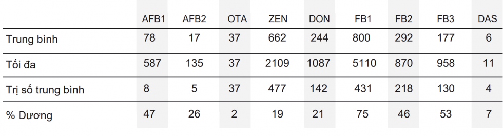 Table 1: Mức độ độc tố nấm mốc (ppb) trên một mẫu thức ăn chăn nuôi (gia cầm và lợn) từ Việt Nam