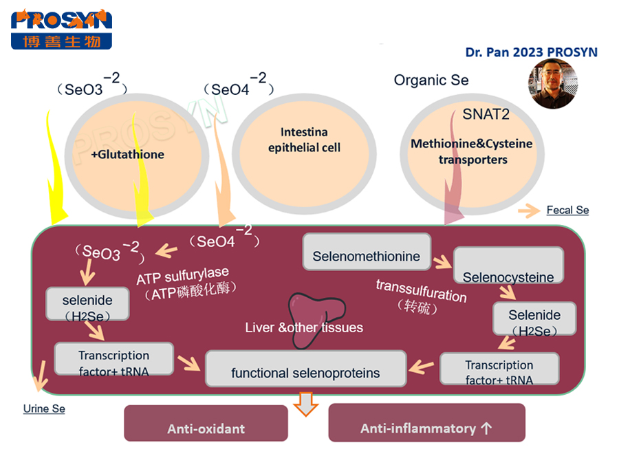 Selen vô cơ và Selen hữu cơ sau khi vào cơ thể động vật có cùng một con đường chức năng cuối cùng, đó là tổng hợp Selenoprotein. Hiện tại, 35 Selenoprotein đã được tìm thấy ở động vật có vú, hầu hết chúng tồn tại ở dạng Selenocystein (Sec), bao gồm cả Glutathione peroxidase (GSH-Px).